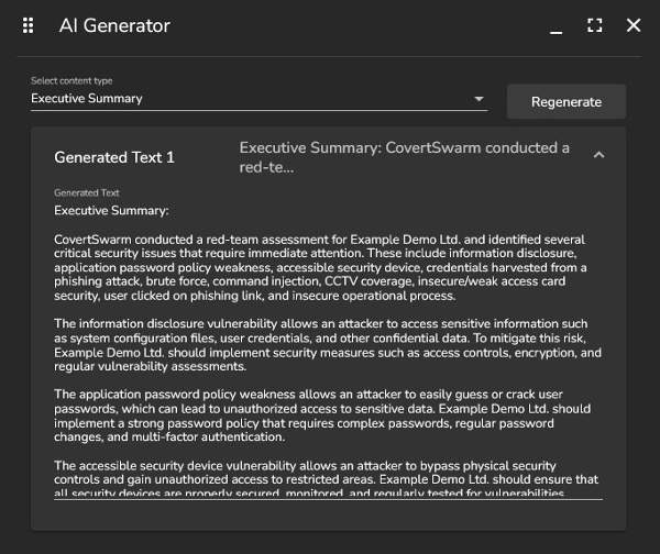 This does mean that the generated content does not include full contextual information, but our expert teams use these AI-drafted responses to cut down on the time spent reporting to ensure that more time is spent on identifying and discovering potential security risks to our clients.